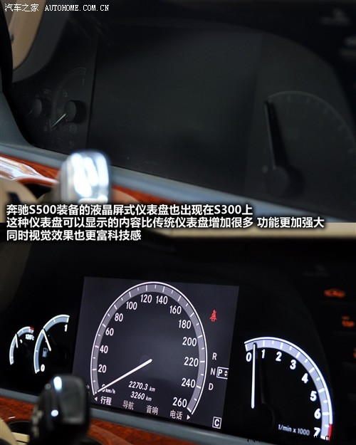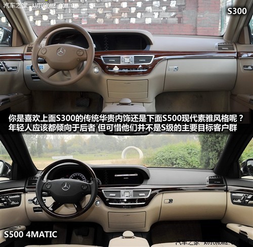 进入S300L的车内,首先发现这辆车采用了有别于S500L 4MATIC上的内饰配色,深红色的实木装饰搭配浅棕色和浅黄色的组合在很多标榜豪华性的车型上都出现过,这种配色基本上可以算是豪华气质的代名词了,但我不喜欢,周围的同事也都不喜欢,因为我们都觉得S500L 4MATIC上的那种搭配更有味道,也更符合奔驰典雅尊贵的形象,不过我们这些年轻人都不是S级所要面对的目标客户,所以真正哪种好还是等50岁以上的那些总裁们来定吧。