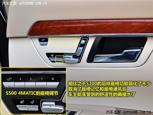 尽管主人身份毋庸置疑,但S300L车主的待遇可有所降低。和前排座椅一样,S500L 4MATIC上的三组座椅记忆无一幸免全被精简掉了,同时炎热夏日很容易被人怀念的座椅通风也不见了,舒适程度确实打了不少折扣。