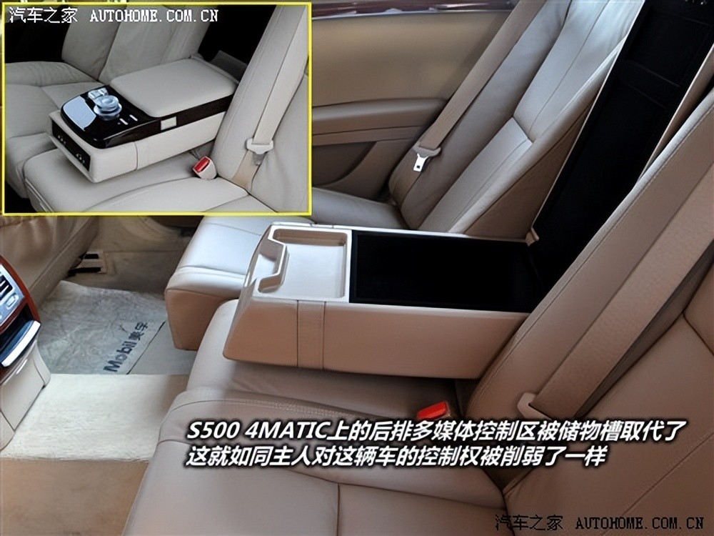 正如上文所说的,对这辆车拥有最大控制权的才是真正的主人,但可惜的是S300L的车主权利被无情的削弱了。S500L 4MATIC上的后排多媒体控制区被替换成储物槽和杯架,因此坐在后排的人无法调节音响、无法查看车辆信息更无法享受DVD或车载电视,而这些坐前排的人都可以拥有,如果感到不平衡也没办法,至少你拥有主人的身份,这是不变的事实。