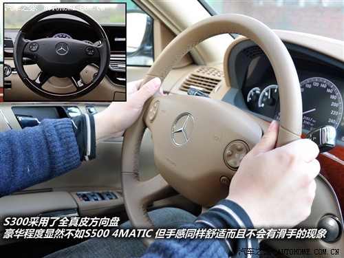 看过笼统的整体后我们把注意力放在了局部配置上。S300L的方向盘相比高配车型有了些材质的变化,S500L 4MATIC上的皮木结合改为全真皮包裹,不可否认视觉上的尊贵感确实略有降低,但这种全真皮式的方向盘手感同样细腻,更重要的是没有了滑溜溜的实木部分,真皮方向盘操控起来更加贴心顺手。