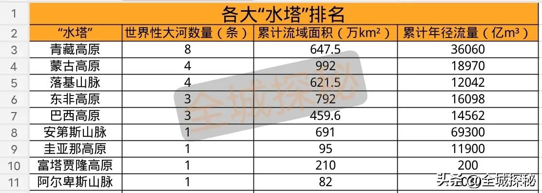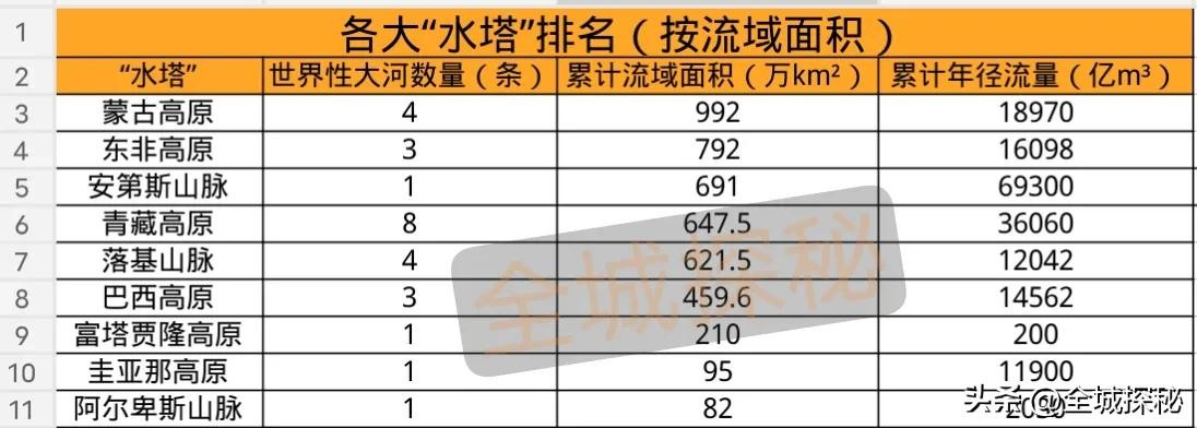 其他的“水塔”里,东非高原排名第二,流域面积加起来为792万平方公里,安第斯山脉位列第三,691万平方公里,青藏高原第四,647.5万平方公里;