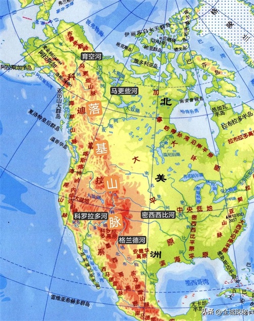 北美洲地形图,落基山脉是很多世界性大河的发源地