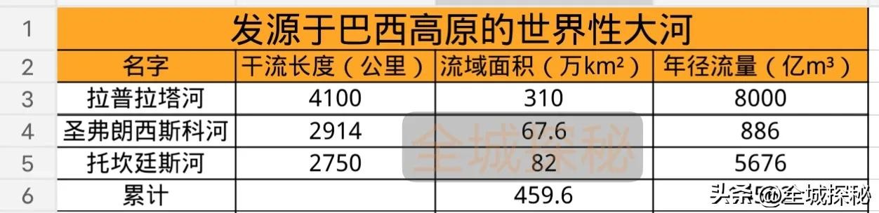 整体上,发源于巴西高原的3条世界性大河,流域面积加起来达到459.6万平方公里,年径流量14562亿立方米。