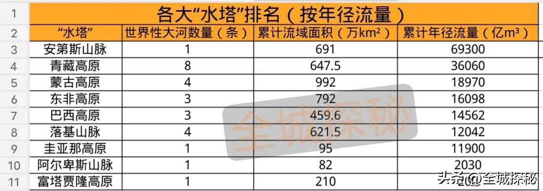 3.如果以年径流量合计排名,安第斯山脉凭借一条亚马逊河,就力压其他所有水塔排名第一,年径流量高达69300亿立方米;