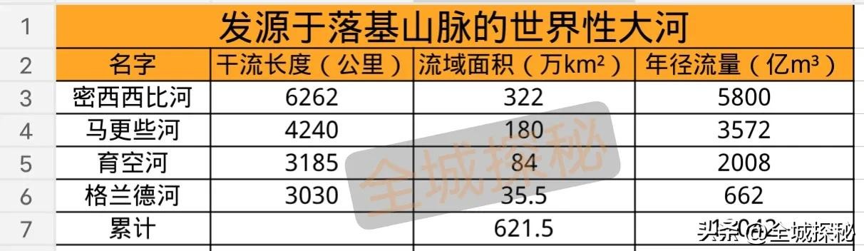 整体上,以落基山脉为源头的4条世界性大河,流域面积加起来达到621.5万平方公里,年径流量合计达到12042亿立方米。
