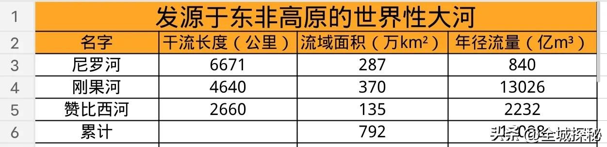 整体上,以东非高原为源头的3条世界性大河,流域面积加起来达到792万平方公里,年径流量高达16098亿立方米。