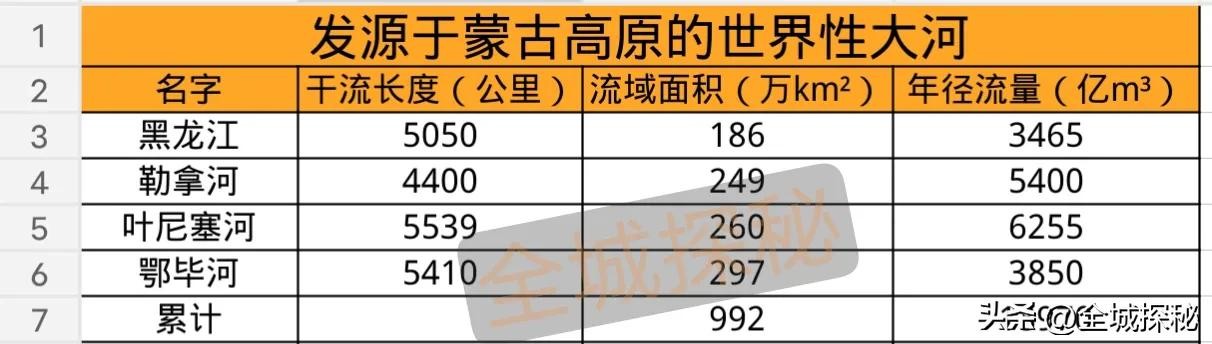 整体上,发源于蒙古高原周边的4条世界性大河,流域面积加起来高达992万平方公里,年径流量合计达到18970亿立方米。