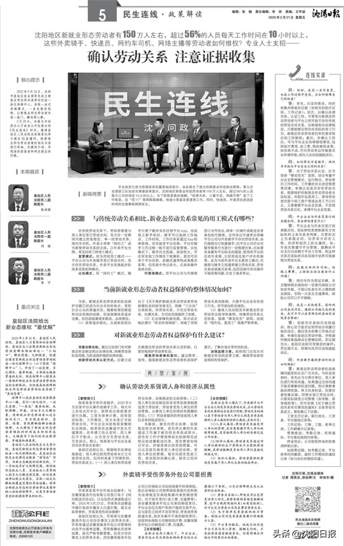 2月20日,沈阳日报与市政府办公厅政务公开处联办的《民生连线》栏目,邀请皇姑区人民法院法官做客沈阳日报社5G直播间,就新就业形态劳动者维权相关内容进行详细、权威的介绍,并现场回答读者和网友提出的问题。