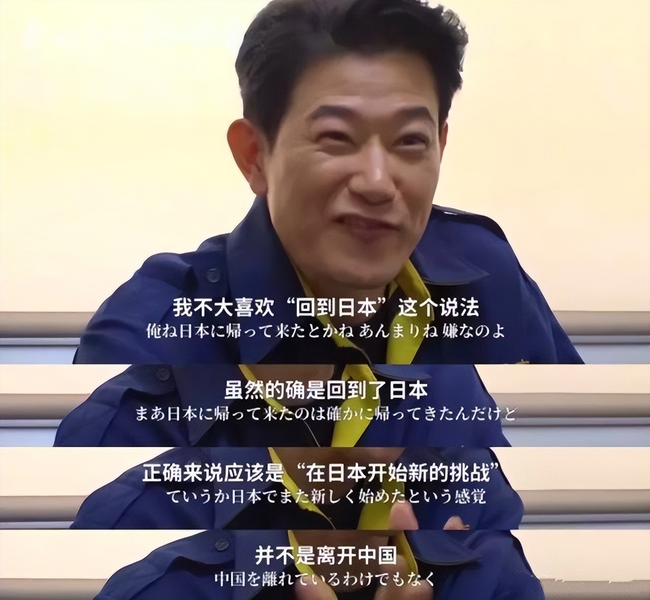 刚回到日本时,他发展得并不顺利,几乎没有人认识他,他全然把自己当成一个新人发展,时刻在前辈面前表现出低调谦逊的态度。他不想让日本观众小看他:这家伙不就是在中国出了名而已,也不怎么样。