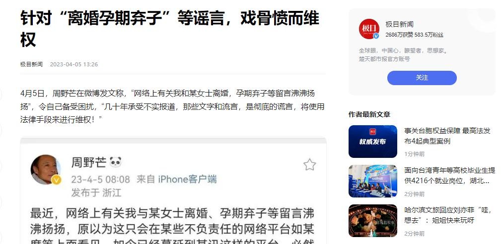 极目新闻 2023-04-05 针对“离婚孕期弃子”等谣言,戏骨愤而维权