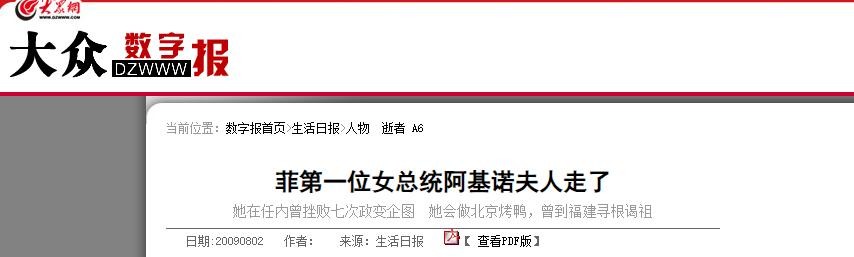 2009-08-02 大众网 大众数字报 生活日报 菲第一位女总统阿基诺夫人走了