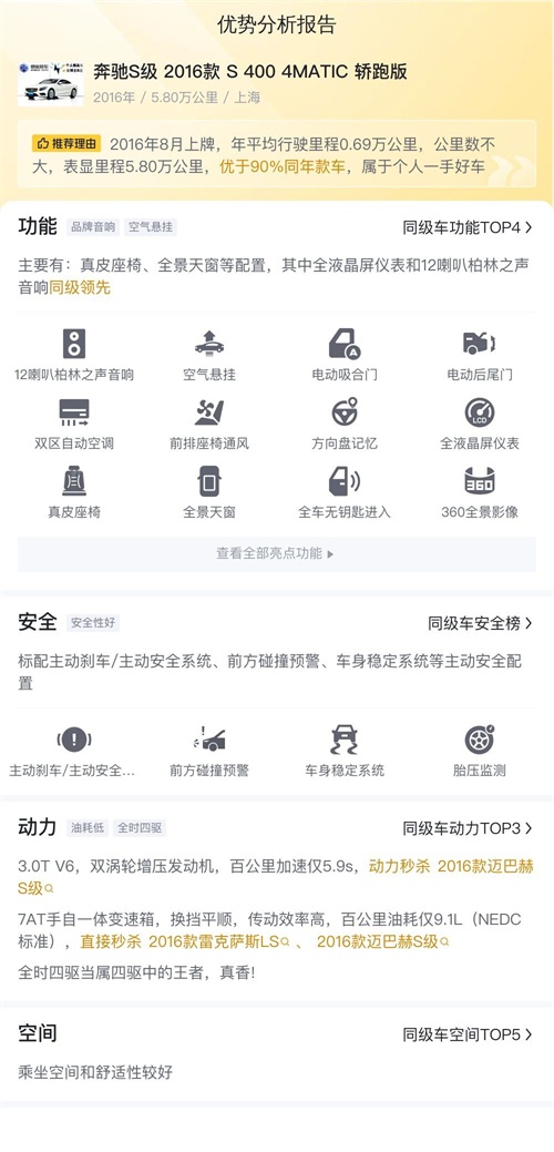 今天我要为您介绍的是一款2016年8月上牌的奔驰S级 2016款 S 400 4MATIC 轿跑版,这辆车目前在上海地区出售,上牌地也是上海,至今行驶了5.8万公里,新车指导价为130.8万,而现在的二手车报价为49.6万,未过户。