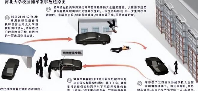 原来,就在2010年10月16日晚上,李启铭驾驶着他新提的黑色轿车冲进了校园,他在校园里横冲直撞,不少散步的学生都被他吓了一跳,在校园内他高速行驶不慎撞倒了两名女同学。车辆猛地撞上她们,直接把她们高高甩起,接着又狠狠地摔到地上。