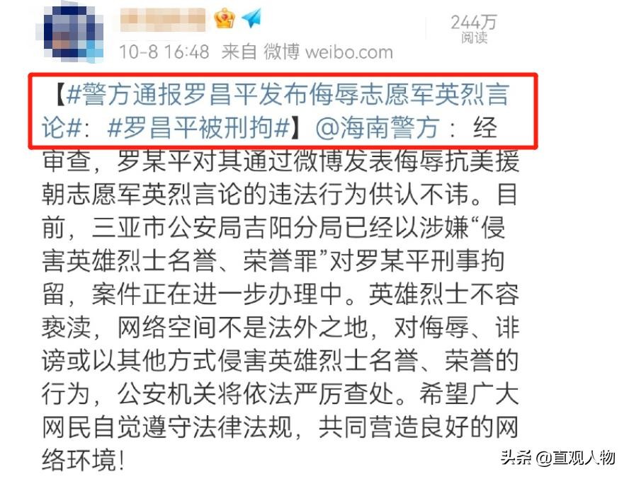 众所周知,之所以说长津湖战役惨烈是因为那场战役发生在温度低至零下三十摄氏度的时候,中国人民志愿军第九兵团三个军,在这样的艰苦的环境之中重创了美国的王牌军第十军,创造了抗美援朝战争中全歼美军一整个团的记录。可就是在这场战争中,志愿军为了能够伏击敌军,在寒冷的环境中一排排地伏在地上,手握枪支弹药摆出战斗的姿态,仿佛形成了一道道纵然跃起的冰雕群像,让人心颤!从此“冰雕连”就成了一座精神的丰碑,一种文化的符号,一种被国人传唱的悲壮,被载入军史。可是就是这样令国人缅怀、痛心的时候,那些仇视解放军、志愿军的小人也冒了出来,以恶毒的语言肆意侮辱长津湖烈士,这样的卑劣的行径,实在是令人不齿、令人痛恨!在网友的一片讨伐声中,他依旧死性不改、我行我素,跑到海南与好友“把酒言欢”,甚至还将照片发到网上,公然挑衅网民。但作为一个媒体人,他似乎已经忘记了网络并非是法外之地,应该做到谨言慎行,他更忘了正义也许会迟到,但却永远不会缺席。网友们见此情景,纷纷举报,罗昌平作为网络大V情影响力之广令人生畏,此番行为对于国人而言是伤口上撒盐、是忘本、是狗彘之行!出来混迟早是要还的,罗昌平此事涉及侮辱先烈,造成的影响极为恶劣,警方已对其实施刑事拘留。