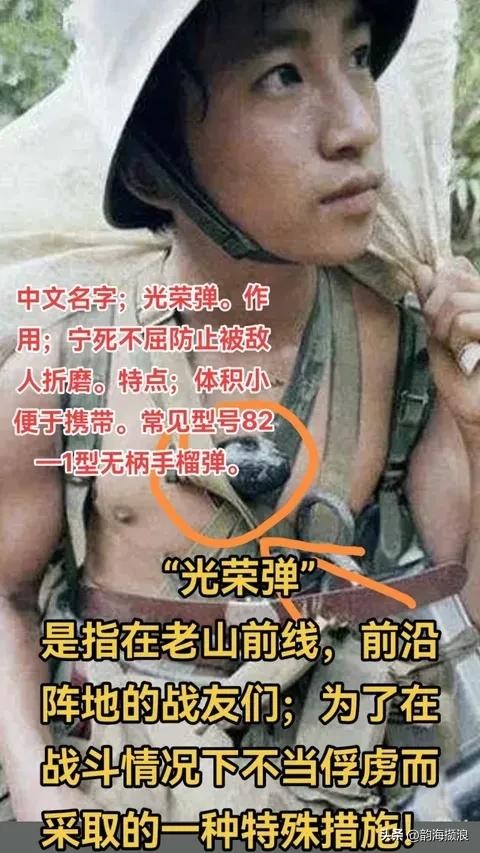 光荣弹,是指在老山前线的前沿阵地上的战友们,为了在战斗情况下不当俘虏,不被敌人侮辱折磨而采取的一种特殊措施。但网上有人说,光荣弹是特制的,从拉火到爆炸只有零点七秒。