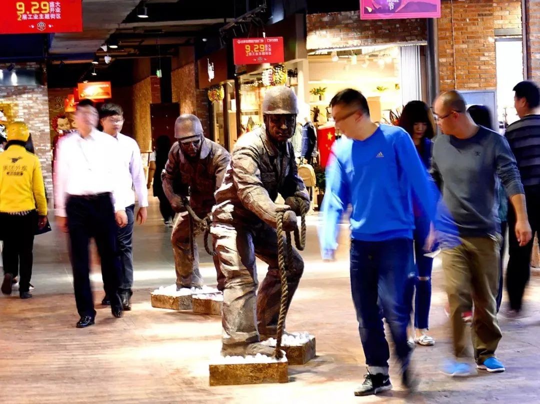 比如,北京石景山万达广场的“厂东门1919”主题街区,用齿轮、锅炉、列车、管道,一秒带你穿越回激情燃烧的首钢岁月。