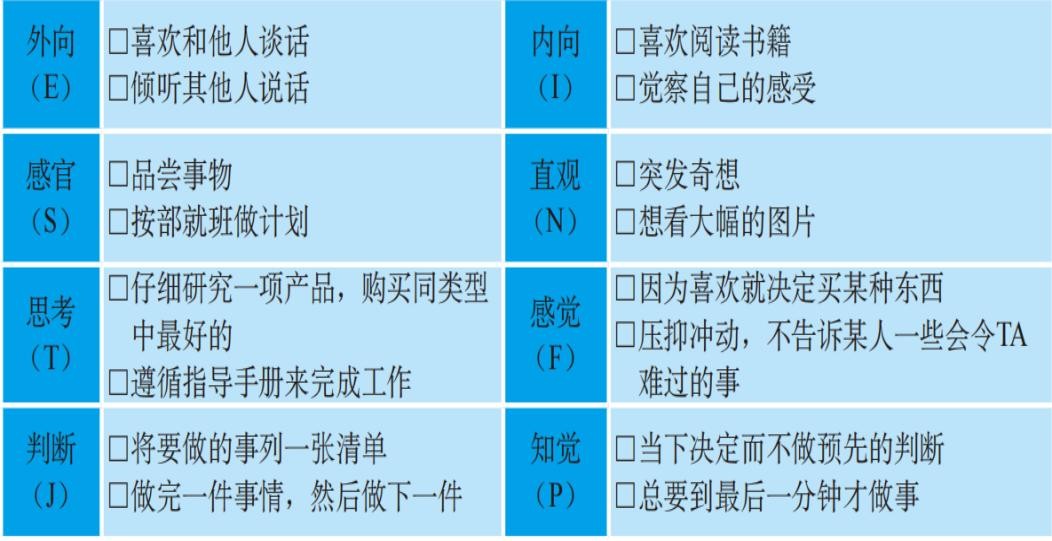 2) MBTI 职业性格测试:这是国际上较为流行的职业人格评估工具。它从动力、信息收集、决策方式、生活方式四个维度,每个维度有两个方向,共计八个方面,把不同个性的人区别开来,共分出 16 种人格类型。通过测试可以了解自己的性格特点以及适合的职业方向。