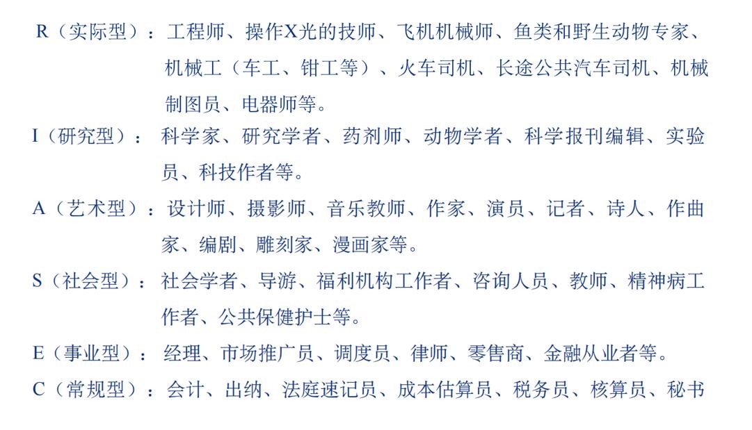 1)霍兰德职业兴趣测评:由美国著名职业指导专家约翰·霍兰德编制。该测试基于霍兰德六型人格理论,将人的职业兴趣分为六个维度:现实型、研究型、艺术型、社会型、企业型和常规型。它可以帮助了解自己的职业兴趣和倾向,从而更好地选择适合自己的职业发展方向。