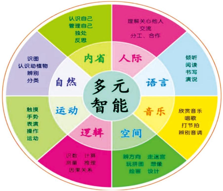 能、逻辑数学智能、空间智能、身体运动智能、音乐智能、人际智能、内省智能和自然观察智能等。分述如下: