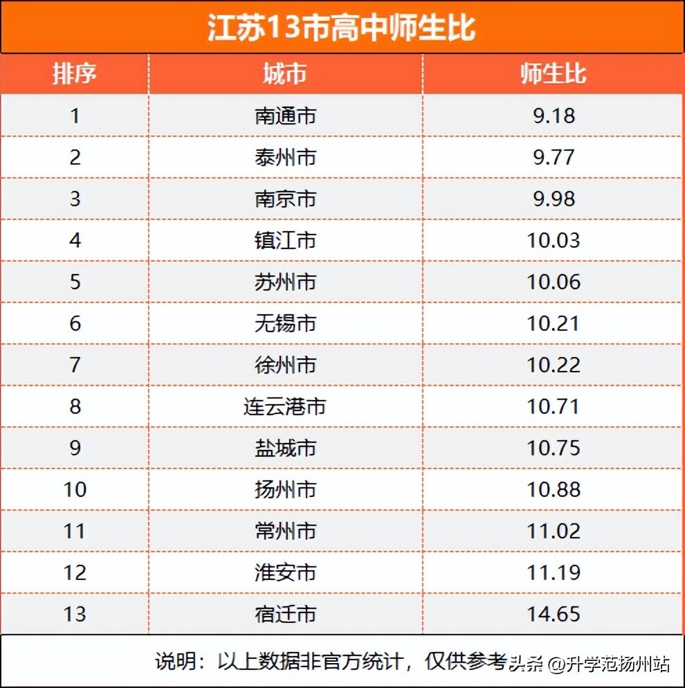 从上表中可以看出:南通的师生配比情况最好,泰州和南京基本上都是每个老师平均负责不到10个学生。