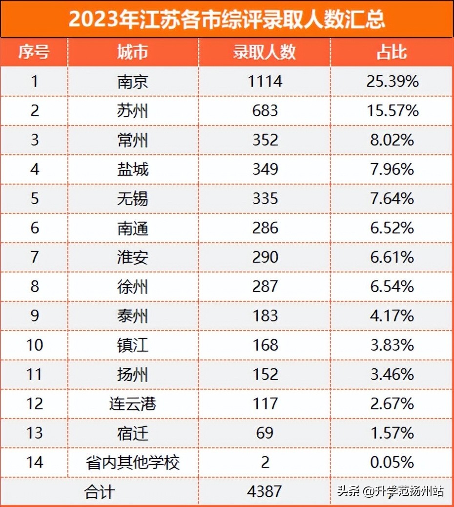 综合评价录取人数最多的是南京1113人,苏州紧随其后683人,排名第三的常州录取352人,排名最后的宿迁市录取人数仅69人。