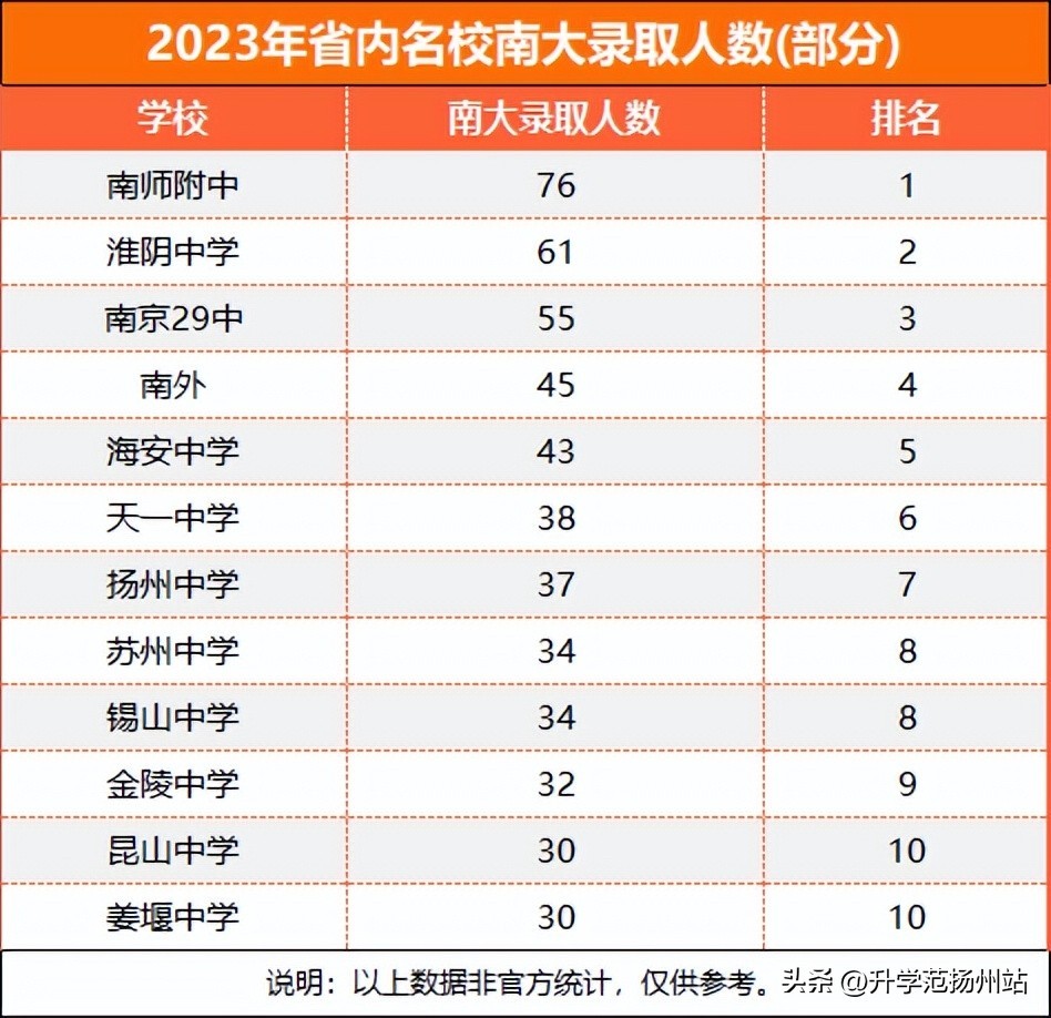 再来看今年南京大学的录取情况,录取人数排在前五的高中,分别是南师附中(76人)、淮阴中学(61人)、南京二十九中(55人)、南外(45人)、海安中学(32人)。
