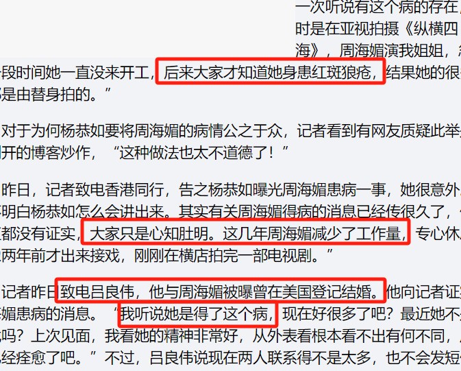 这一消息一经披露,引起了媒体的广泛关注。同行们纷纷表示理解杨恭如为何说出这个事实,尽管这涉及个人隐私,但却是众所周知的事实。而前夫吕良伟对此回应:“是听说过这个病,但应该好很多了吧。”这一事件让大家了解到红斑狼疮这个病,也让周海媚成为这个疾病的代言人,尽管她在公开场合一直避而不谈。
