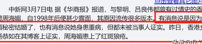 回到1998年,《流氓大亨》让周海媚成为TVB力捧的花旦之一,然而,慢慢地她退出了观众的视线,引起了各种猜测。有人传言她秘密结婚,有人说她身患重病。而真相却是由一位好友——杨恭如在2006年爆料。原来,周海媚患上了红斑狼疮,这个时候很多戏份都只能由替身来完成。