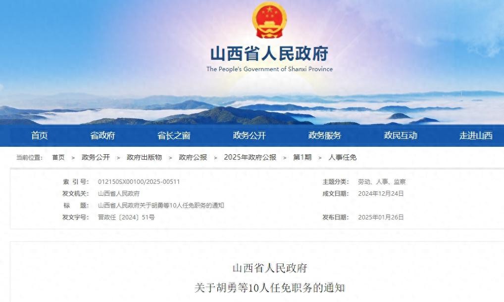 胡勇为山西转型综合改革示范区管理委员会主任(试用期一年);