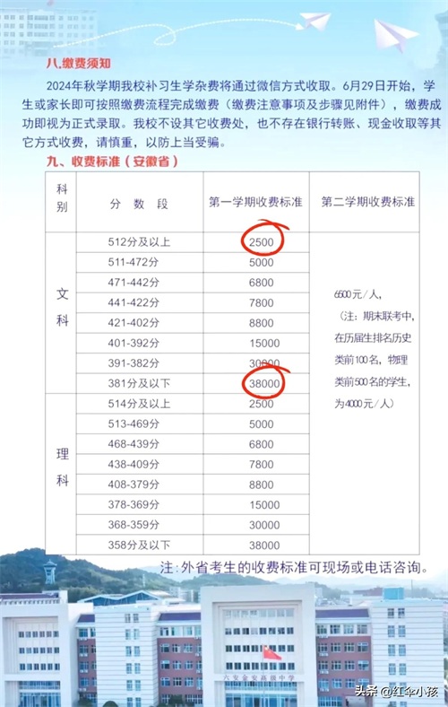 除了人数以外,更令人惊讶的是毛坦厂中学的复读费,根据高考分数,第一学期的学费少则2500元,多则38000元,差距之大令人咂舌。
