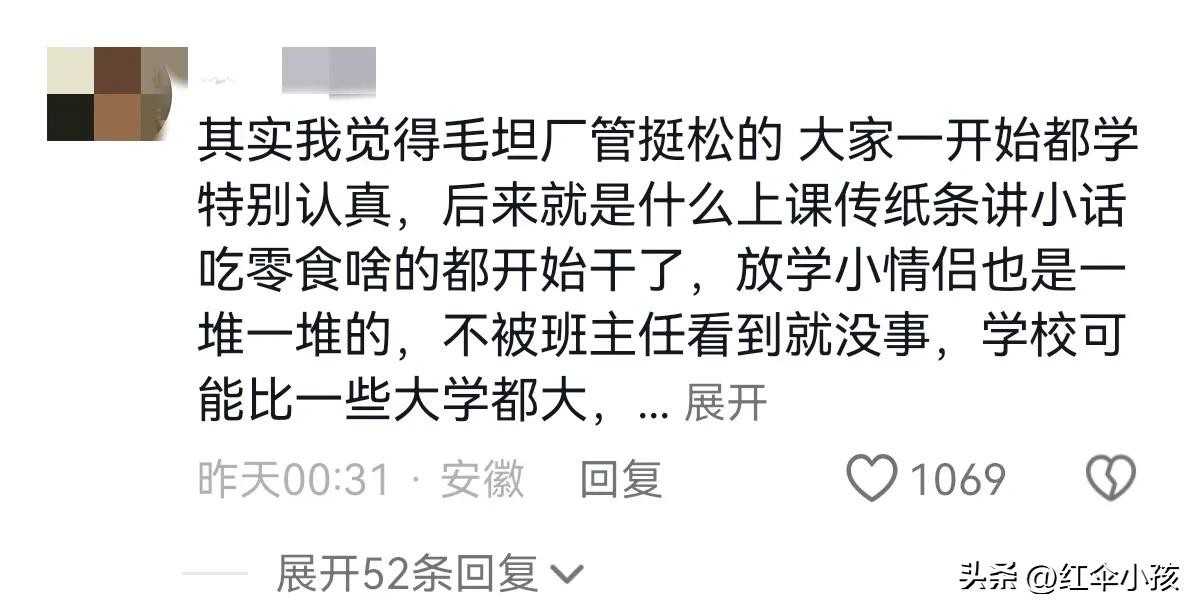 有的网友透露,毛坦厂中学并没有想象的管理严格,只是刚开始趁着热乎劲大家都很认真,时间长了,上课照样吃零食传纸条,放学也是小情侣谈恋爱,并没有传说中的那么苦。