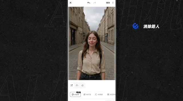 来到某个景点,拍的照片不满意,上传AI相机,你可以使用AI改图,完美消除路人或杂物。还可以修正闭眼、调整表情、头发换个颜色甚至换件衣服。遇到阴天,就给照片加点阳光。也能更换你想要的背景,最后发朋友圈,配一段有生命力的文案。