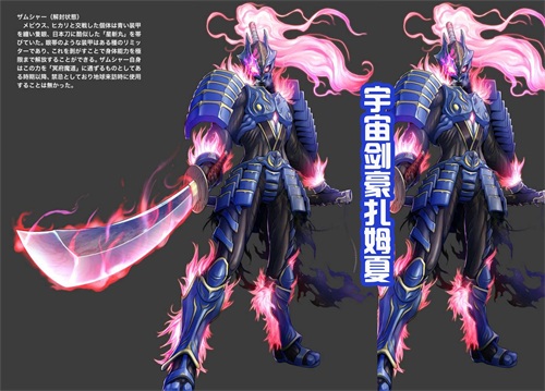 而这个就是属于宇宙剑豪扎姆夏的最终形态,也是黑田朝生描绘的解封形态。这是与梦比优斯和希卡利交战的个体,拥有一套蓝色的盔甲,眼睛是紫色的。手中的武器是“星斩丸”,能够劈开奥什玛彗星。这个状况下,宇宙剑豪扎姆夏能够将自身的能力发挥到极限。而对于宇宙剑豪扎姆夏的最终形态,感觉黑田朝生绘制得非常棒。尤其是背后的头发和长刀,就好像是燃烧起火焰了一样。