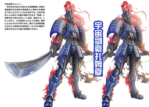 然后这就是黑田朝生绘制的宇宙剑豪扎姆夏的升级版,这个造型已经非常帅气了。身体上穿着一身蓝色的铠甲,并且拥有一头红色的长发,手中拿着一把巨大的长刀。宇宙剑豪扎姆夏的装扮,会让人联想到中世纪日本武士的战斗种族,并且拥有特别的价值观。只是追求个体的战斗能力和精神力,并且将其提升到极限。本来身体大小和地球人是没有什么差别的,但是经过不断的“修炼”和实战,宇宙剑豪扎姆夏变成了强大的巨人。但是这个变异的原理和机制还是不明确的,除了出色的近距离战斗之外,还拥有超常的认知能力,以及在所有的环境中稳定立足的重力控制能力。